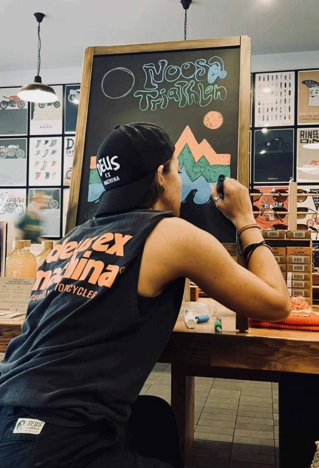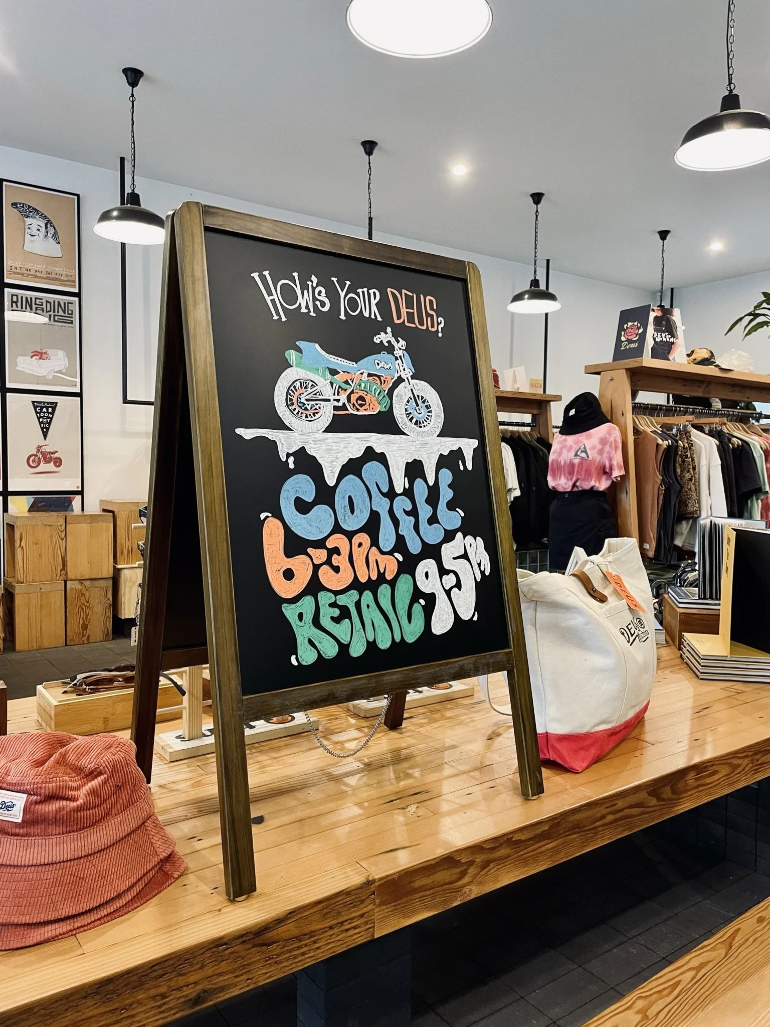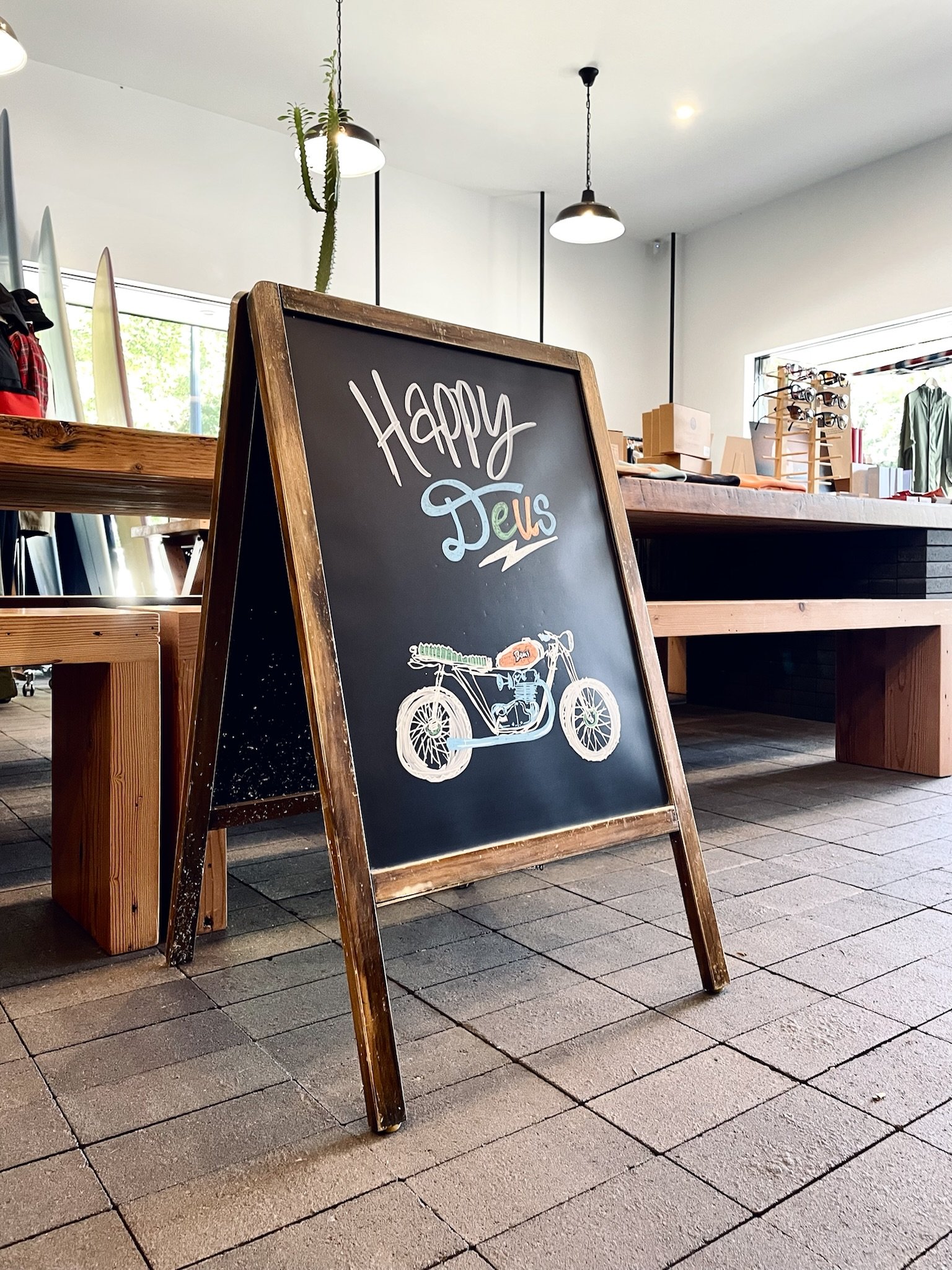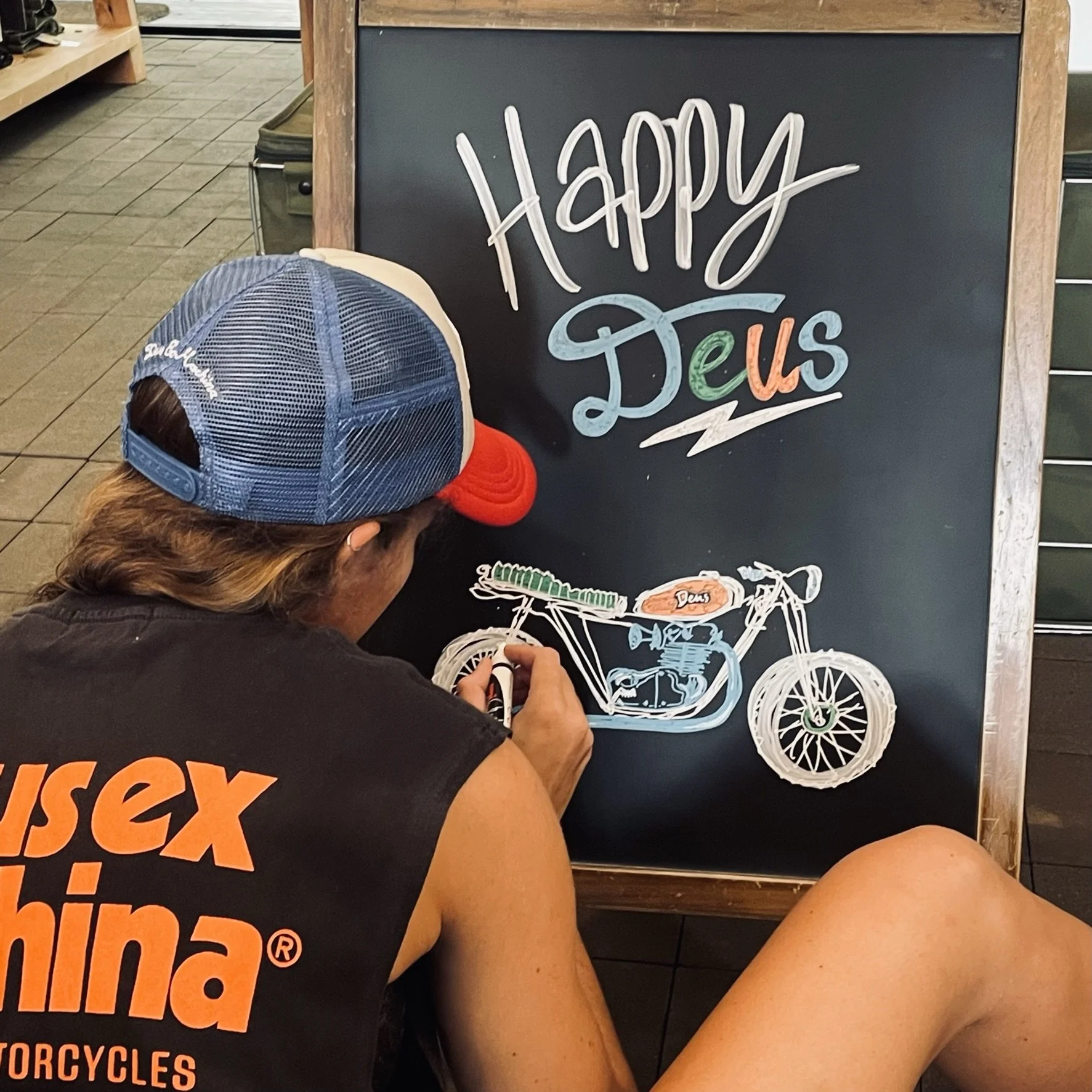 I started sign writing when I worked at Deus Ex Machina in Noosa, Australia. I thank Hailey my friend/manager that gave me the time to get creative with the signs. They become a big hit in Noosa and drew a lot of attention. It also allowed me to be very creative without the ability to rub things out. I mean, I could if I had to but it wasnβt simple, so it was drawing with a pen and running with it. And I loved how it all turned out. Endless possibilities and all imperfectly perfect. I took these skills to other places in Australia and back home in Brighton, England.