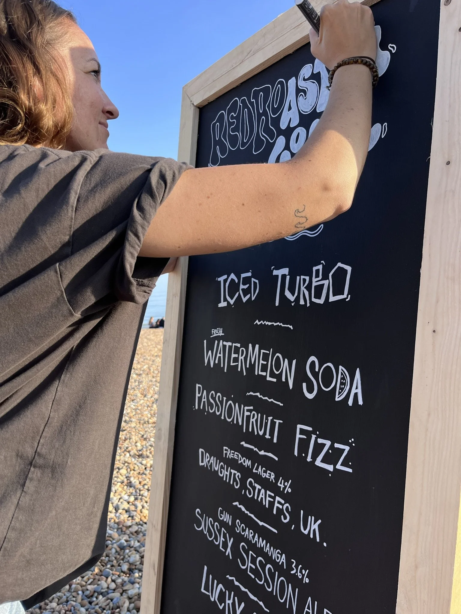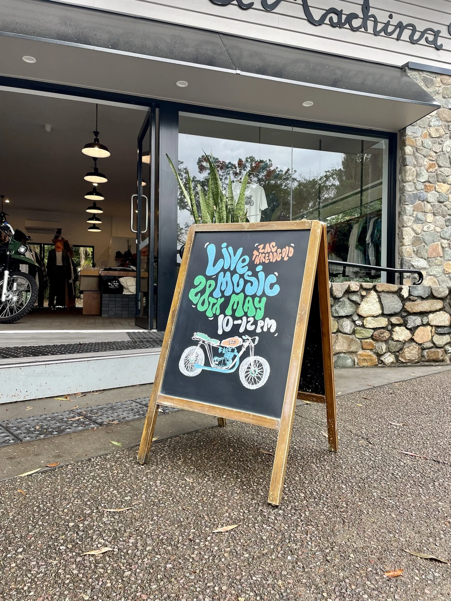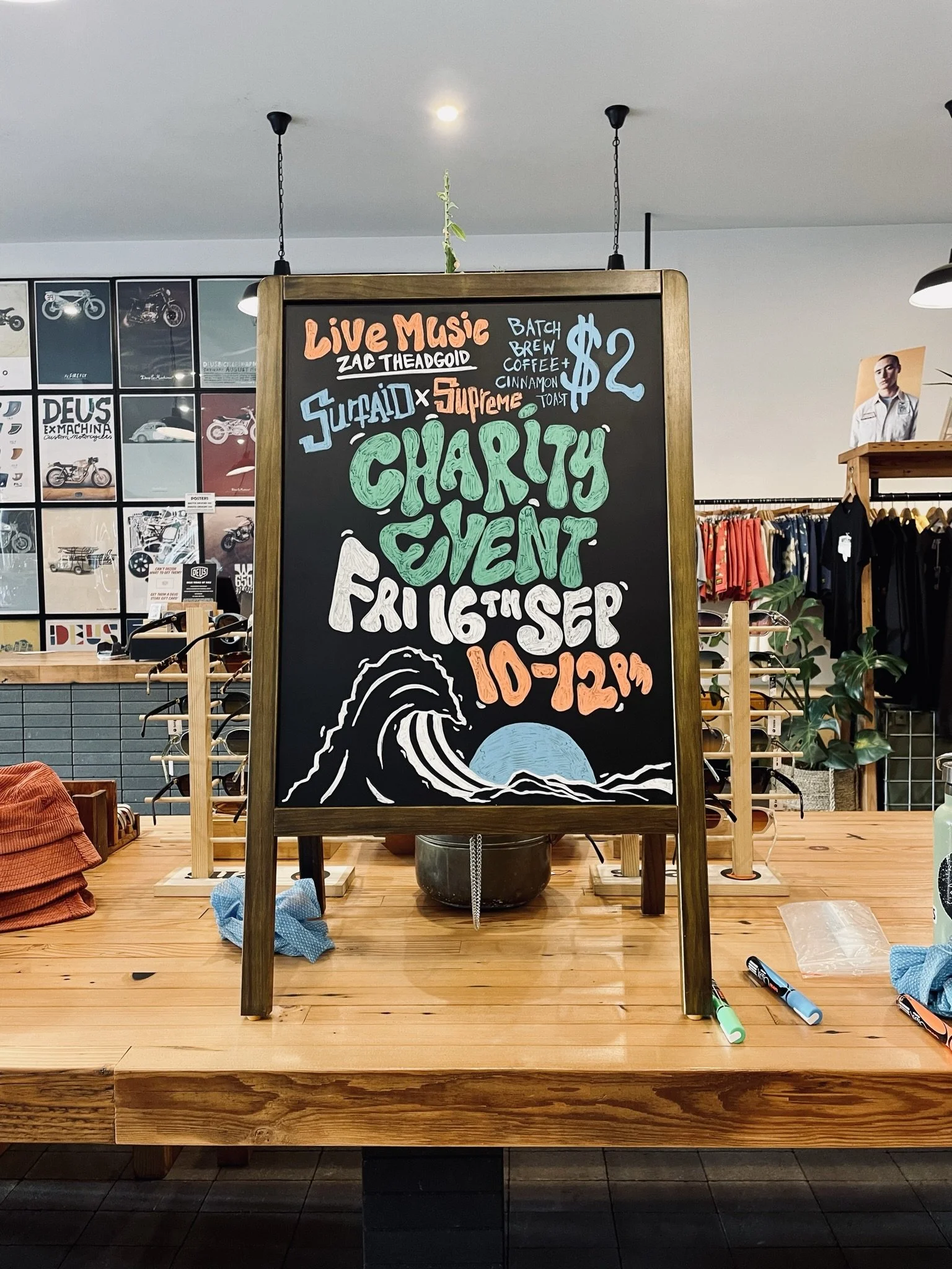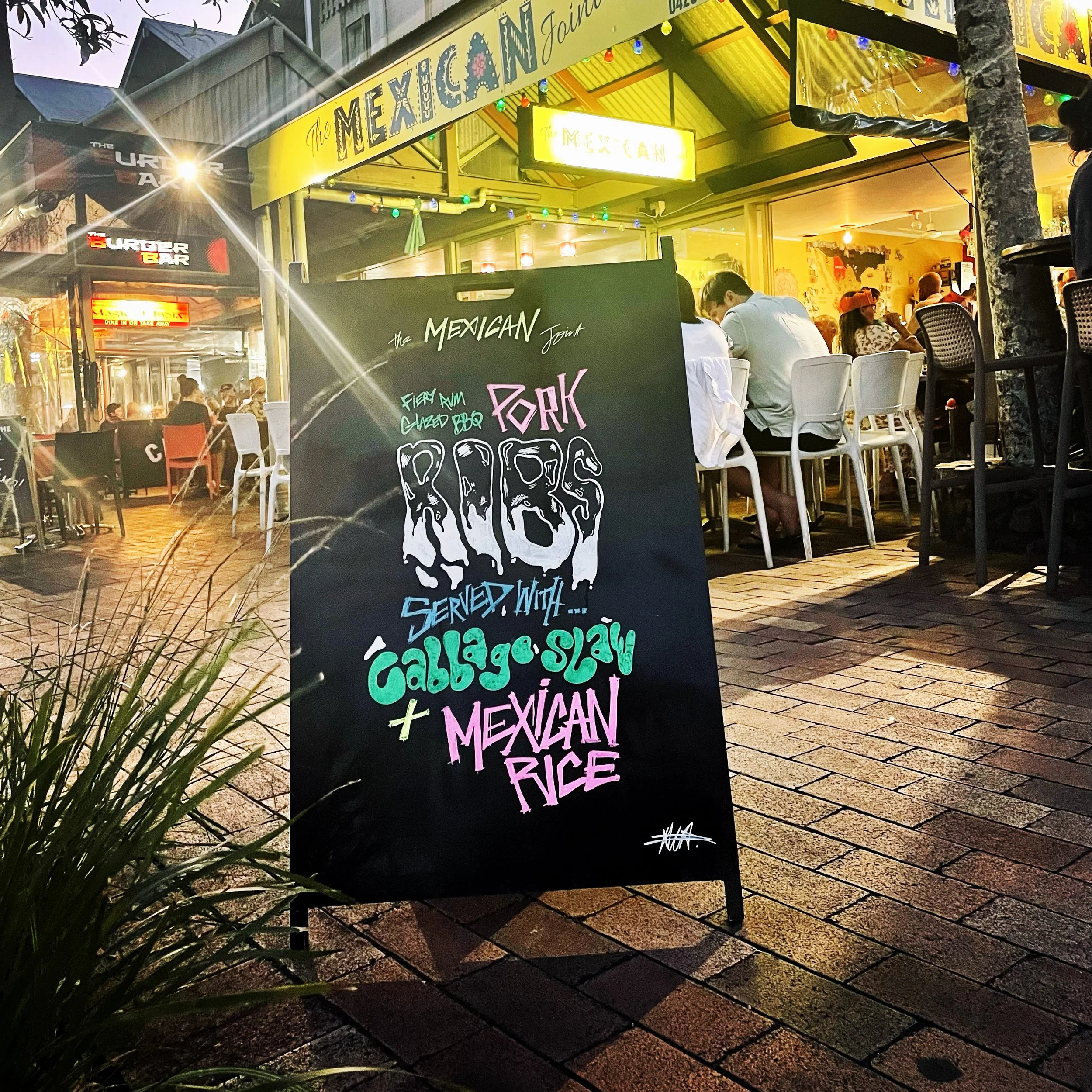 I started sign writing when I worked at Deus Ex Machina in Noosa, Australia. I thank Hailey my friend/manager that gave me the time to get creative with the signs. They become a big hit in Noosa and drew a lot of attention. It also allowed me to be very creative without the ability to rub things out. I mean, I could if I had to but it wasnβt simple, so it was drawing with a pen and running with it. And I loved how it all turned out. Endless possibilities and all imperfectly perfect. I took these skills to other places in Australia and back home in Brighton, England.